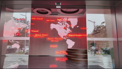 CECOCECO team designed a white oak texture combined with a dot-based world map pattern. Using the world map texture together with dynamic light effects, the installation presents ROE Visual’s international business footprint, while the pixel-like dot structure subtle reference to the core technology behind LED displays. The light oak tone aligns with the overall interior design and adds warmth to the space, creating an atmosphere that is both professional and welcoming.