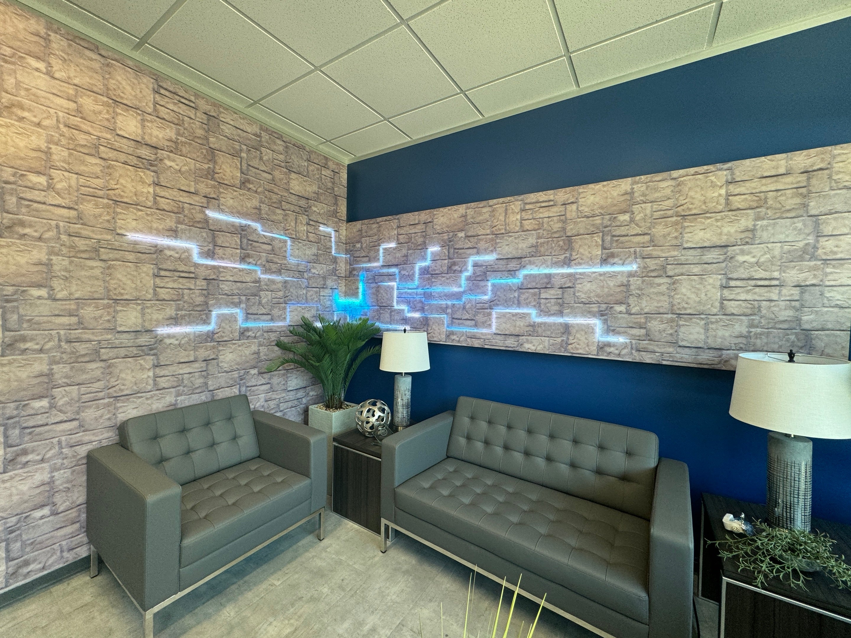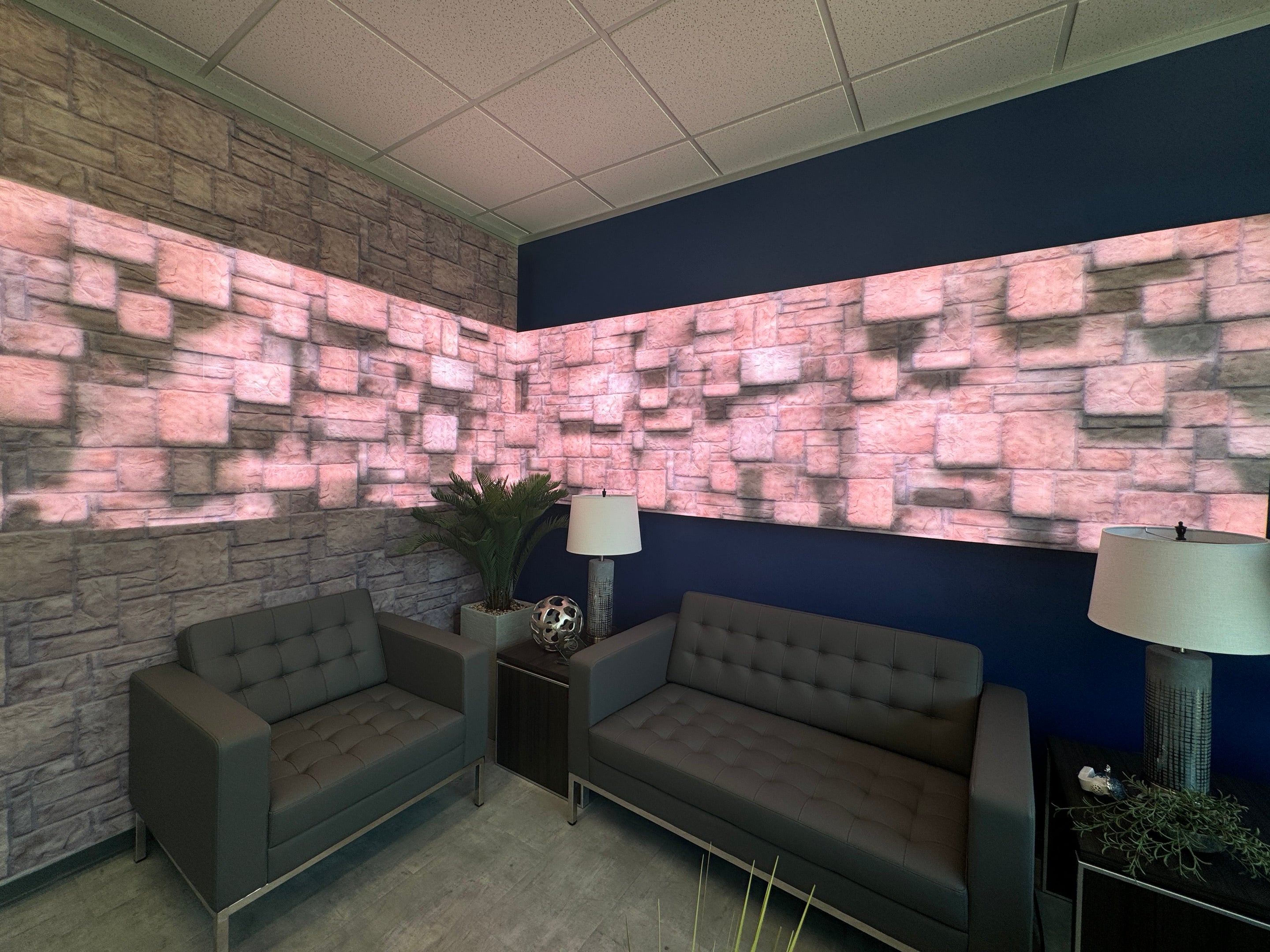 Texas Limestone-Inspired Seamless Design: The limestone-inspired finish provides a natural, regional aesthetic that complements the display and enhances the lobby's overall ambiance. This seamless integration of texture and customizable content draws on local architectural elements, achieving a balance between technical and aesthetic.