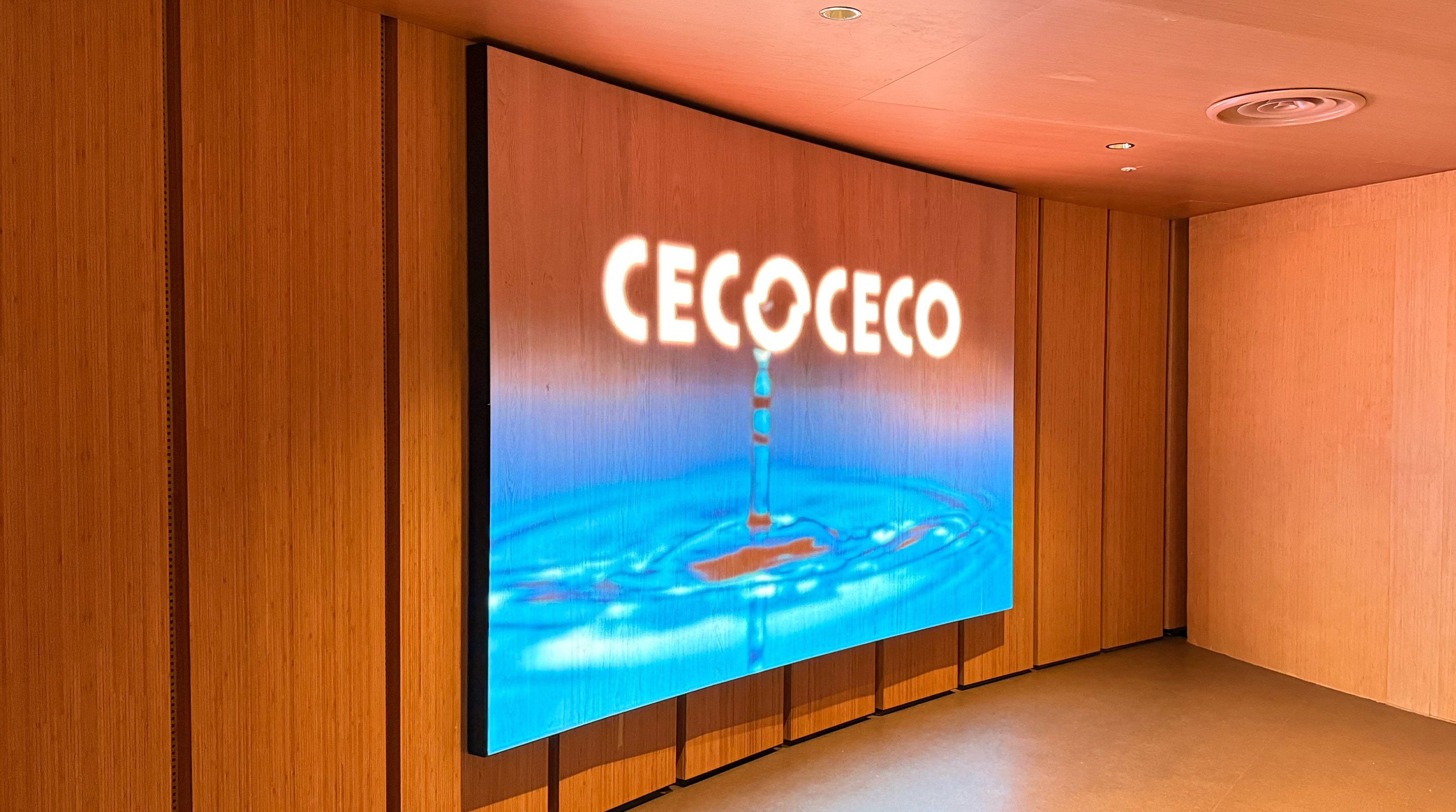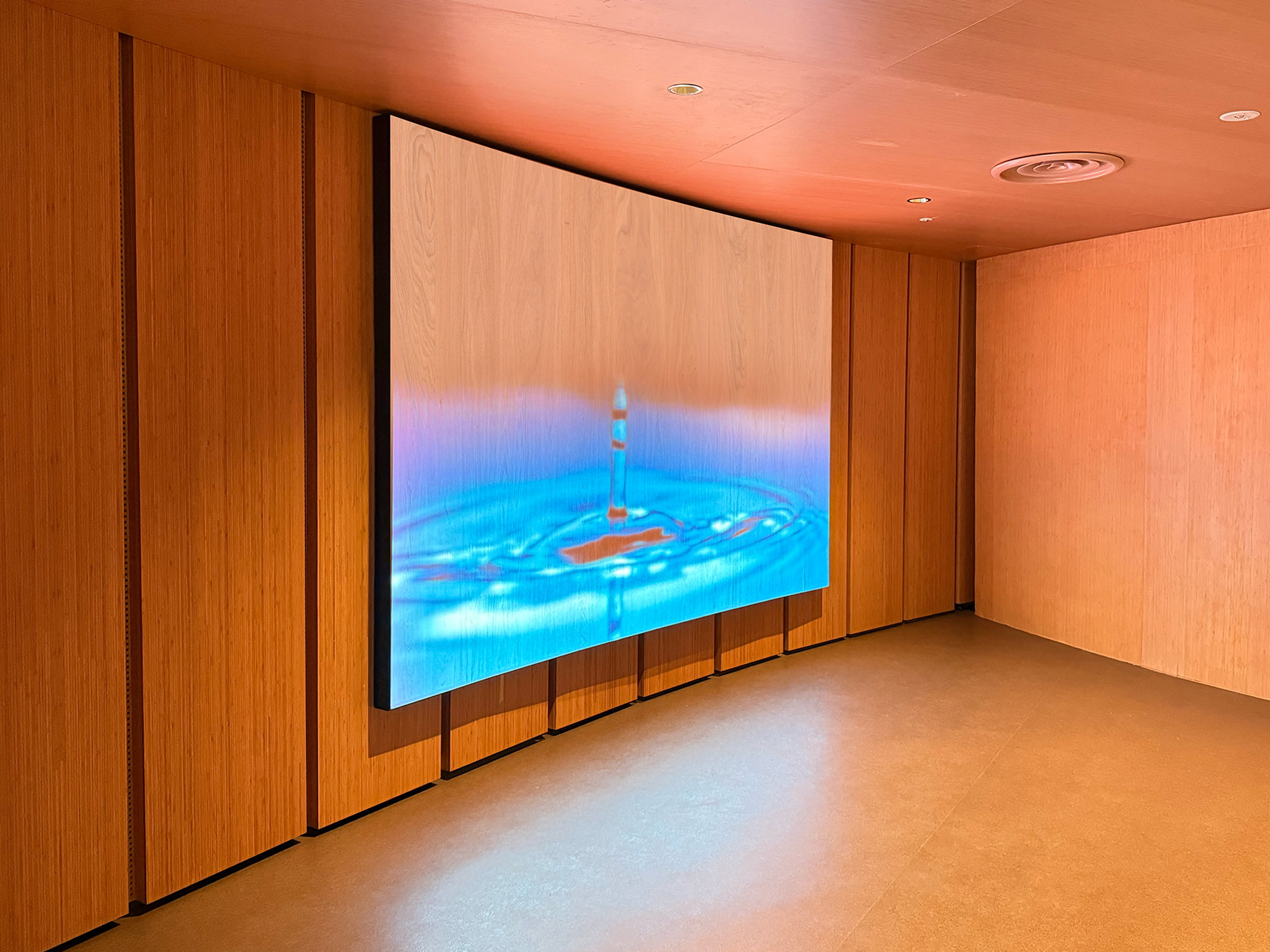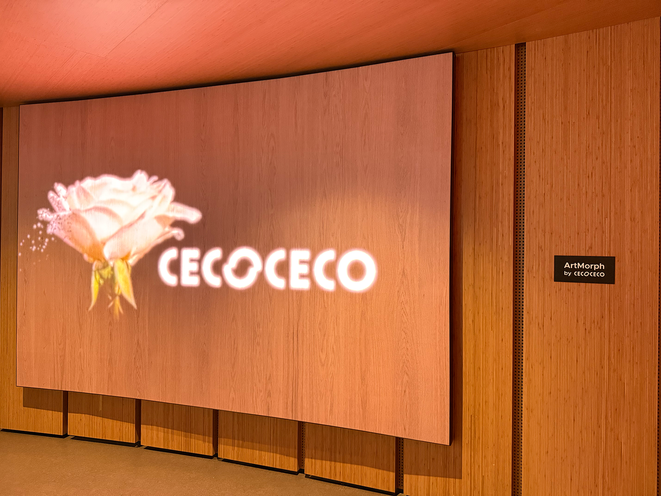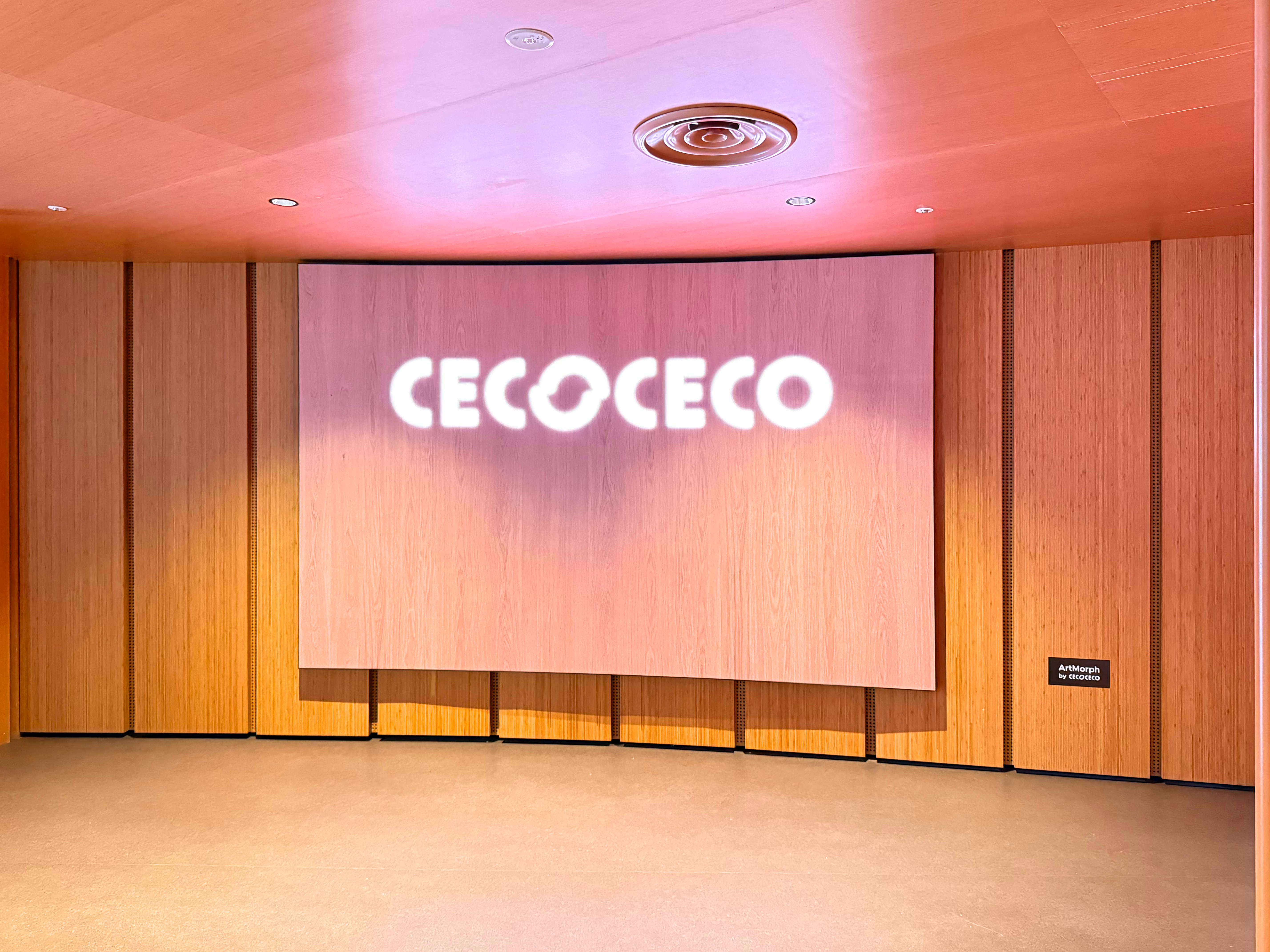The design intent is to achieve complete visual integration with the Pavilion’s interior. For this reason, white oak texture was selected for ArtMorph panels. This project is a curved background wall. CECOCECO precisely measured the angle and implemented a segmented panel configuration. Each panel was set at a 0.5° angle shift, allowing ArtMorph panels to align seamlessly into the overall arc of the wall.