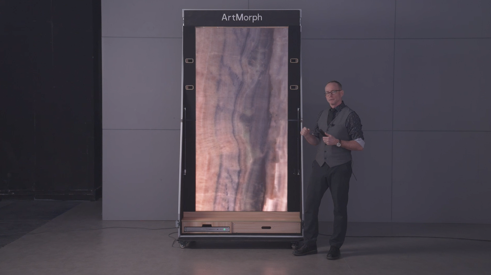 This ready-to-use flight case distinguishes itself from traditional black flight cases with its unique wooden design, blending style and durability. With the assistance of two individuals, the foldable demo case easily opens and securely locks in place, revealing a fully operational ArtMorph display.